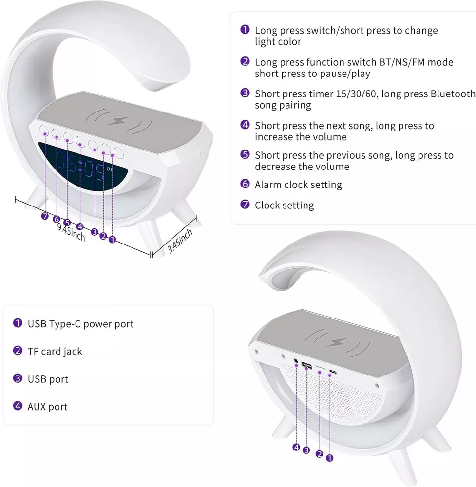 • وظائف متعددة في جهاز واحد: شاحن، سماعة، ومصباح ليلي، مما يوفر لك مساحة ويعزز من راحتك